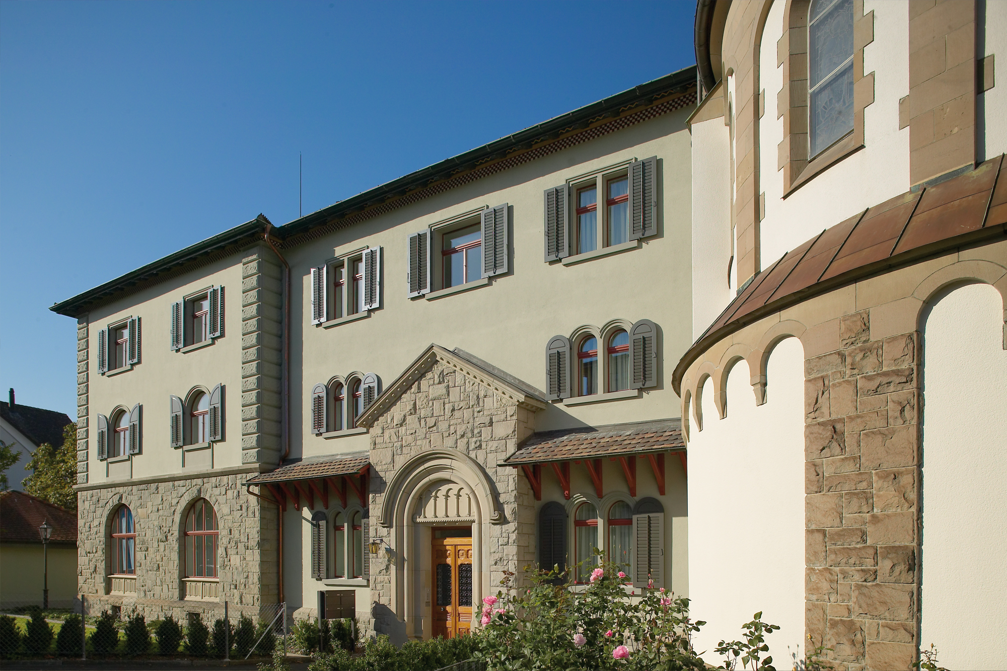 Projektierung und Ausführung des Gesamtumbaues der Liegenschaft mit Einbezug der Umgebungsgestaltung. Bauliche Anpassung in ökologischer und funktioneller Art an die neuen Anforderungen im Wohn- und Bürobereich unter Berücksichtigung der denkmalpflegerischen Anforderungen. Durchgängige Neugestaltung der Grundrisseinteilung des Pfarreisekretariats mit Sitzungszimmer, Wohnung und Studio, sowie der kompletten neuen technischen Installationen mit Lifteinbau und Anforderungen bezüglich Rollstuhlgängigkeit. Neugestaltung der Zugänge und der Umgebung.