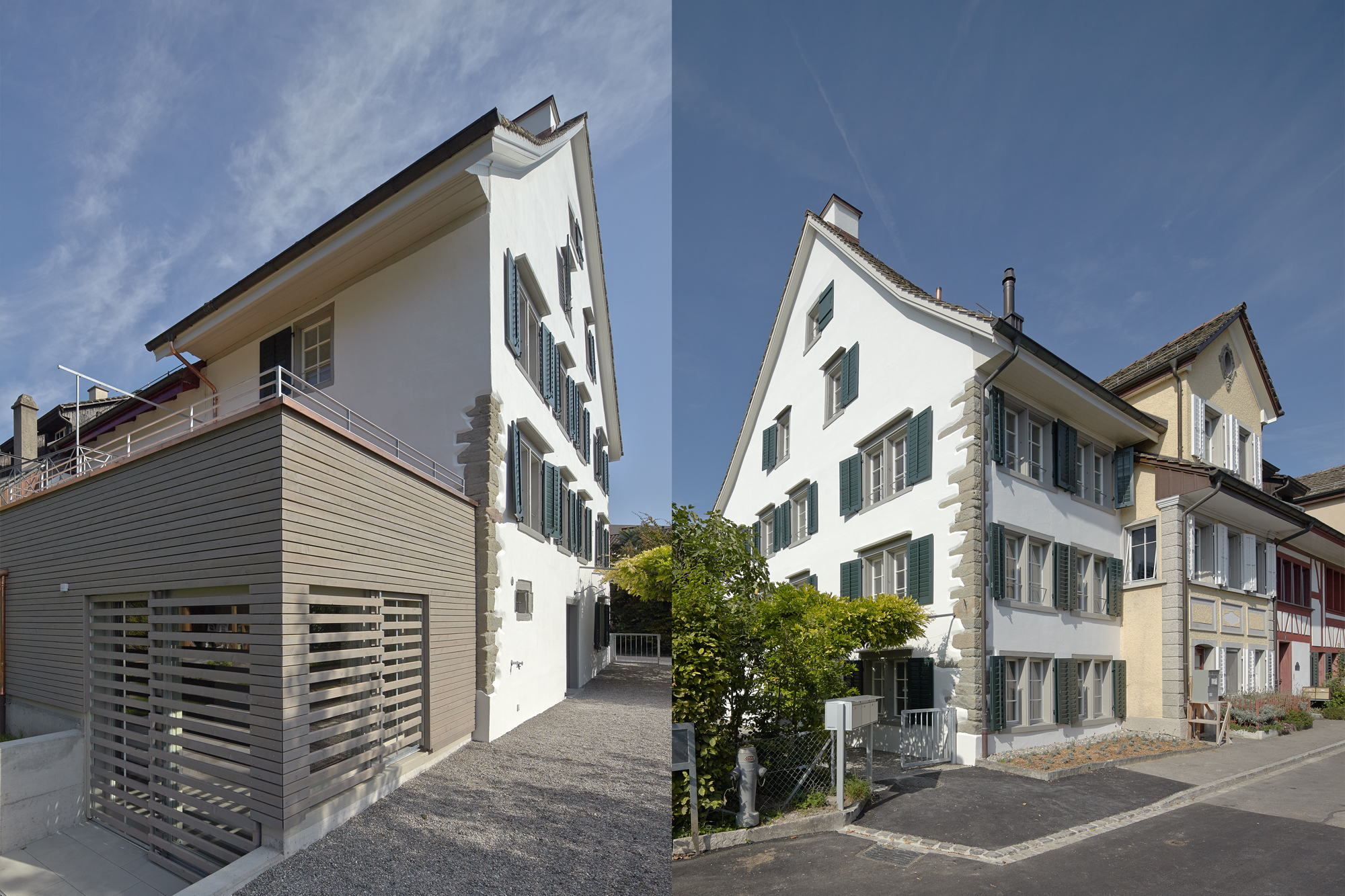 Planung und Ausführung der umfassenden Renovation der Liegenschaft mit Garten, unter Berücksichtigung der denkmalpflegerischen Anforderungen. Umwandlung der ehemaligen Kleinstwohnungen in ein Einfamilienhaus mit Studio durch eine Neugestaltung der Raumaufteilung unter Rücksichtsnahme auf die bestehende Struktur. Erneuerung der gesamten Haustechnik, der Nasszellen und der Küche. Gestaltung und Detaillierung des Innenausbaus mit Farbkonzept der Fassade und Anbau.